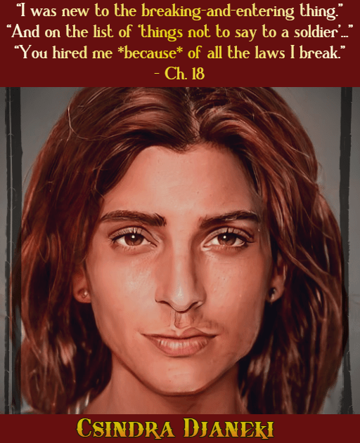 - Relationships: Really likes Csindra. Mixed feelings on Scheffen, apparently.