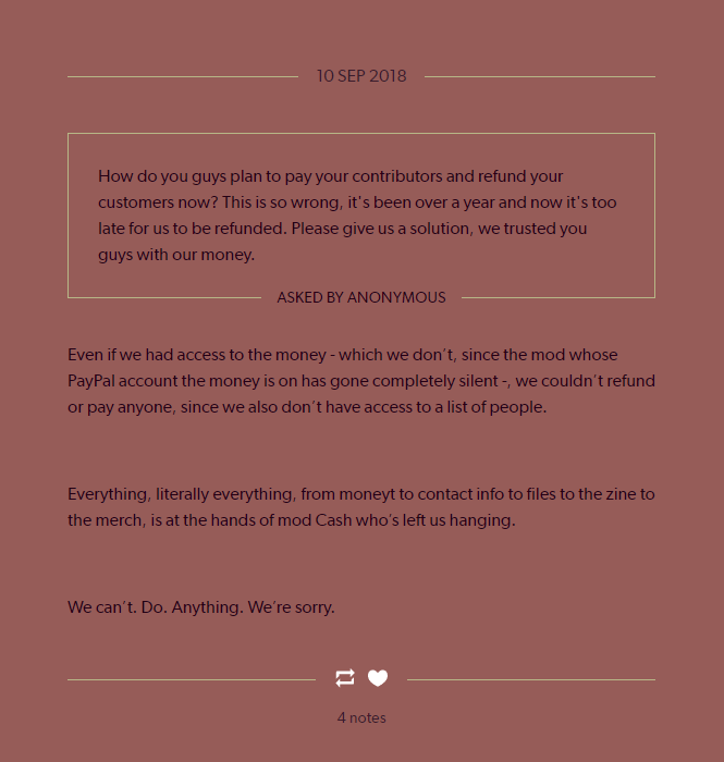 This is far from a one-off. Stories about zines that never shipped, shipped after years in hiatus, emotional abuse and exploitation on mod teams, issues with credit and payment, randomly kicking contributors over ship discourse, and worse abound.